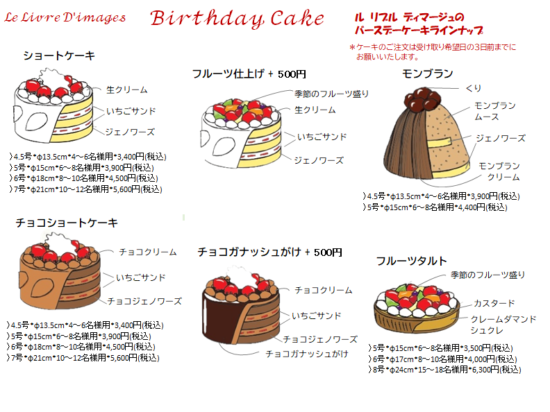 Birthday Cakes 当店は、店舗を持たないケーキ工房です。ケーキのご用命は、ご予約制になります。10,000円(税別)未満のケーキの配送は承っておりませんので、「工房受け取り」として、ご予約ください。①お名前②ご連絡先お電話番号+メールアドレス③お受け取り日時+お受け取り時間④ケーキの種類及び追加仕上げ⑤ケーキサイズ⑥数量⑦メッセージプレートの文言。ご指定無い場合には「Happy Birthday」とさせて頂きます。⑧キャンドルの本数。ご指定無い場合には、小5本お付け致します。